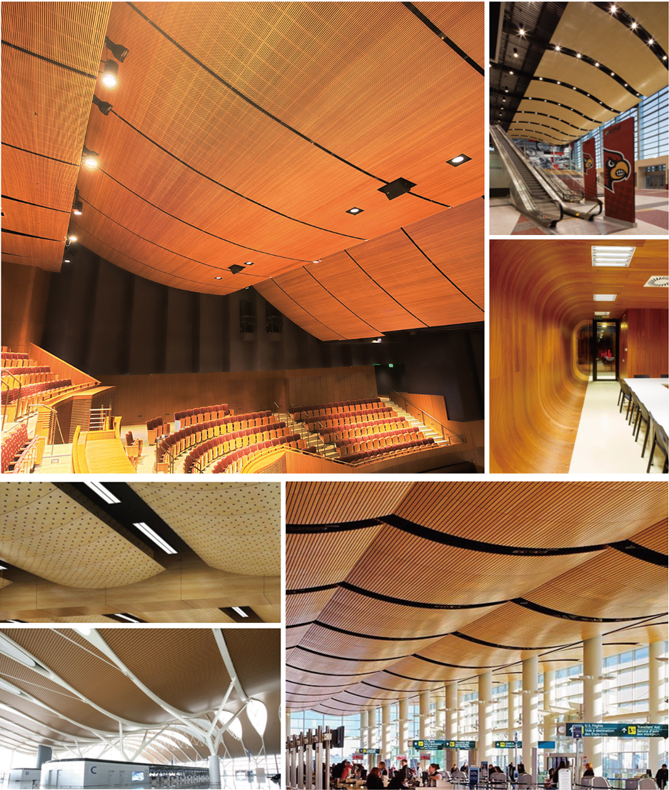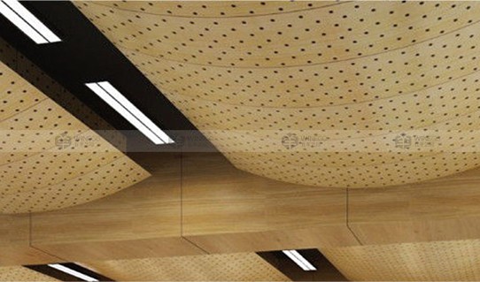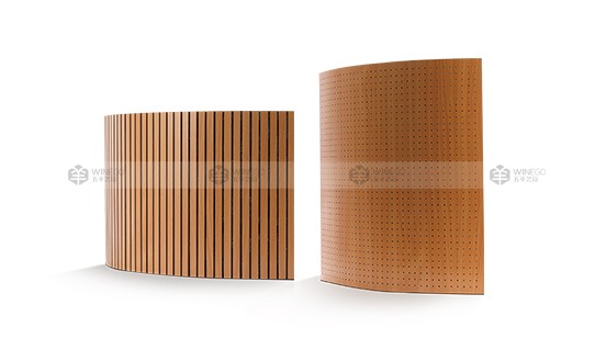 弧形天花以及弧形墻面板,最近越來越受設計師以及客戶的青睞,廣泛的應用于各種高端裝飾設計。我們運用密度板板材的特性,在槽孔以及孔木的基礎上,采用特別的工藝,衍生出弧形板。弧形板的槽孔結構以及通孔結構符合聲學原理,在中低頻吸聲上效果顯著。飾面的弧形結構,有一定程度的擴散效果,改善混響時間顯著,有效提高環境音質飽滿度、清晰度和立體感。另外,飾面的多樣性以及弧形的造型,不僅給客戶多樣化的選擇,也增強墻面天花裝飾的流暢感和立體感。