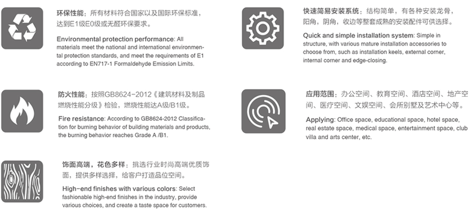 五羊藝冠飾面板系統,選取行業最優質環保防火基材和飾面,采用精湛的制作工藝,出廠前完成所有產品工藝細節,現場只需做簡單拼裝便可,它不僅僅是墻板,而是全套墻面系統解決方案,為客戶提供全方位一站式服務。五羊藝冠飾面板系統包含平面板、造型板、安裝龍骨和陽角陰角收邊系統等。