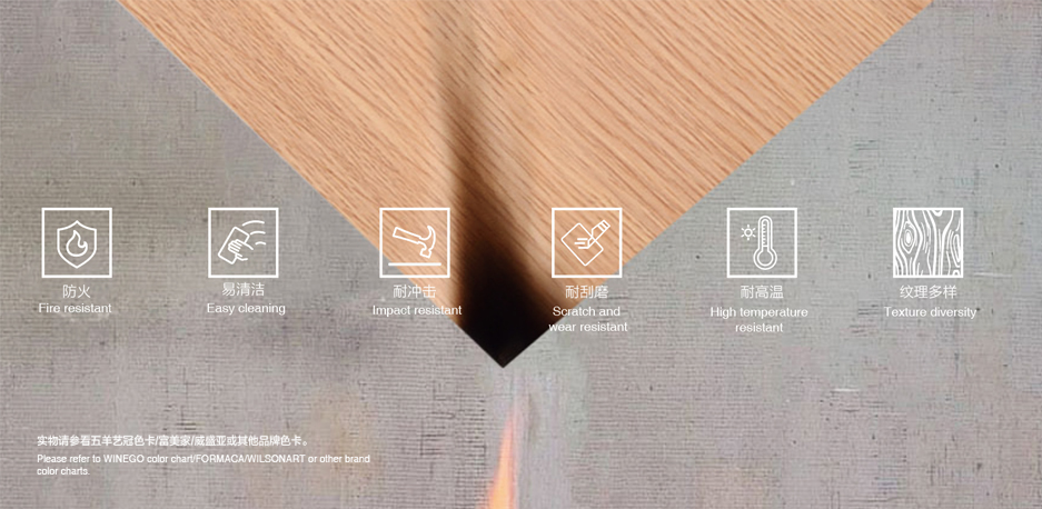 防火板是一種極具極強裝飾性又經久耐用的高壓裝飾防火材料,具有耐磨、耐刮、耐沖擊、耐高溫、易清潔等特點。被廣泛應用于各種室內裝飾表面,如墻面、天花、包柱、隔斷、臺面等等。五羊藝冠的防火板涵蓋了純色、木飾面、亮面、珍珠絨面、浮雕等表面紋理選擇,并具備豐富的板材尺寸,適用于各種空間的不同需求,歡迎您定制。