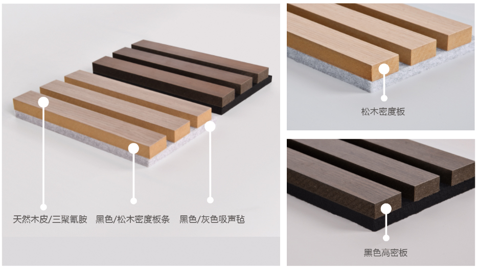 木格柵吸音板由吸聲氈和間隔排列的木條組成,是一種性能優(yōu)異的吸聲擴散材料。聲波因凹凸面產(chǎn)生不同的反射波,進而形成聲音的擴散;而吸聲氈內(nèi)部存在大量連通的孔洞,聲波進入孔洞后產(chǎn)生摩擦變成熱能,有效減少回聲。木格柵吸音板以美觀簡潔的設(shè)計,達到了吸聲和擴散的雙重聲學(xué)需求。
