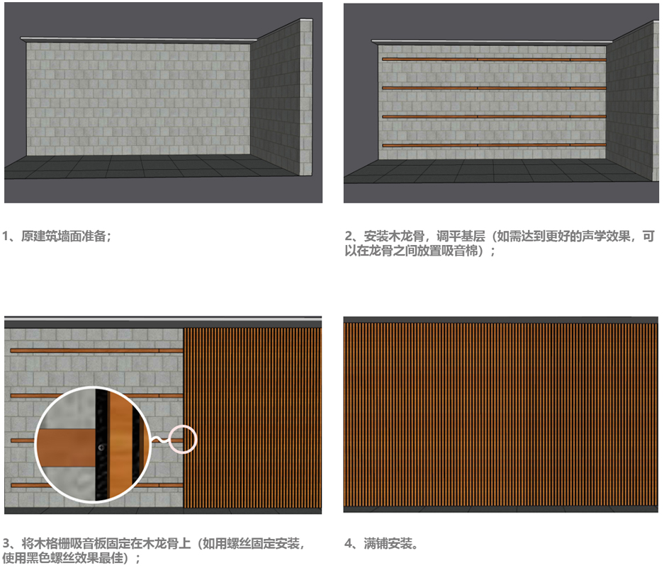 木格柵吸音板由木條和吸聲氈共同組成。每根木條寬27mm,木條之間間距為13mm,也可按客戶需求定制寬度和間距。吸聲氈黑色、灰色或其他顏色可選,外觀現(xiàn)代、時尚。