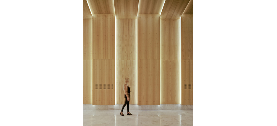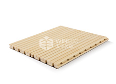 吊頂使用A級木飾面。木飾面比較密實,表觀密度也比較大。木飾面之所以吸聲系數較高一點,主要還是靠木飾面的共振吸聲。木飾面的共振頻率一般是 100—300Hz,飾面板后留有空腔(空氣層),可以改善低頻的吸收性能,而且空腔深度越大,共振吸聲峰值越向低頻移動。木飾面的吸聲峰值處的頻率,基本都集中在低頻,都是在木飾面吸聲結構的共振頻率處。