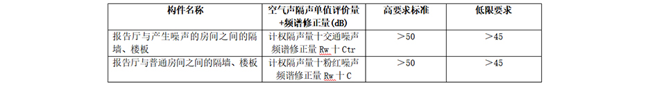 為了防止外界噪聲傳入室內影響報告廳正常使用,故報告廳的門窗墻體樓板等建筑構件需滿足隔聲要求??茖W的隔聲設計能提高語言私密性,提高會議內容的保密性;防止外界噪聲傳入報告廳,降低廳堂使用體驗。