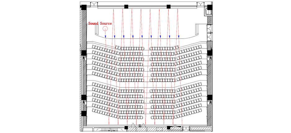 觀眾廳后墻是易產生回聲的界面。紅色點表示聲源,青色線為入射聲線,紅線為反射聲線。可清楚看到,聲音從舞臺發出后,經后墻反射,大量的回聲返回到舞臺。
