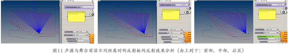 由于演奏臺上聲源位置眾多,按照傳統的CAD作圖法無法一一進行分析。本項目中,借助參數化工具,對不同聲源點反射板的反射效果進行分析。圖 11給出3個聲源點位置的反射效果。可以清楚看到,反射板造型能適應聲源點位置變化,均能為整個觀眾區域提供覆蓋的早期反射聲,且分布均勻,反射界面有效面積利用率十分高。