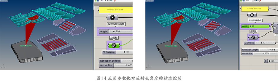 如圖 14所示,通過參數化精確控制反射板的旋轉角度,同時能直觀地觀察到早期反射聲能覆蓋于觀眾區上的情況,能快速確定有利于聲學效果的反射板安裝角度,提高整個反射板的反聲效率。