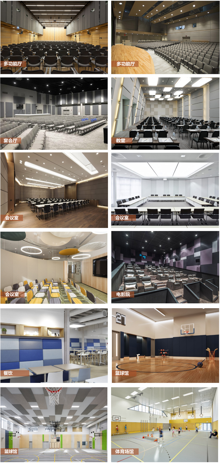多功能廳、宴會廳、教堂、會議室、電影院、禮堂、體育館等對聲學(xué)要求嚴(yán)格的場所。