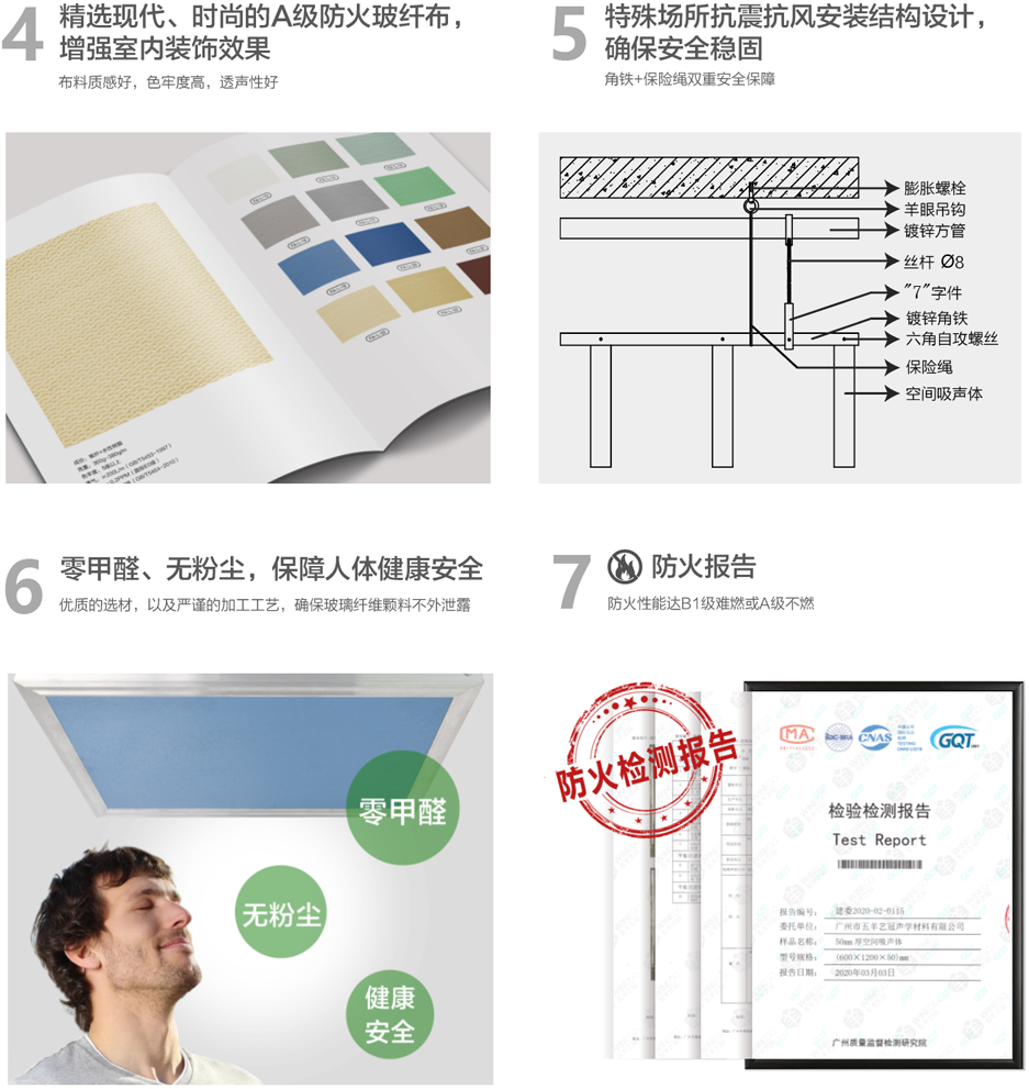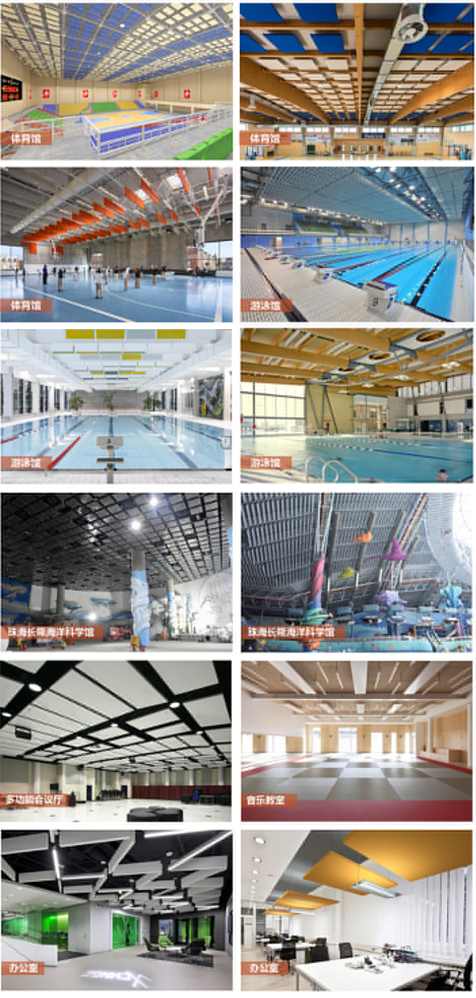 各類(lèi)體育場(chǎng)館(游泳館等)、會(huì)展中心、演藝廳、多功能會(huì)議廳、辦公室、教室課室、酒吧餐吧等需要強(qiáng)吸聲高環(huán)保的場(chǎng)所。