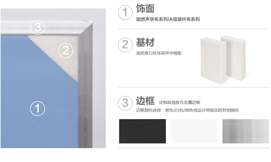 • 結(jié)構(gòu)度定制高強(qiáng)合金邊框,內(nèi)置白色環(huán)保聲學(xué)棉,棉的表面復(fù)合環(huán)保密閉吸聲氈,表層包裹A級(jí)防火玻纖布或阻燃聲學(xué)布